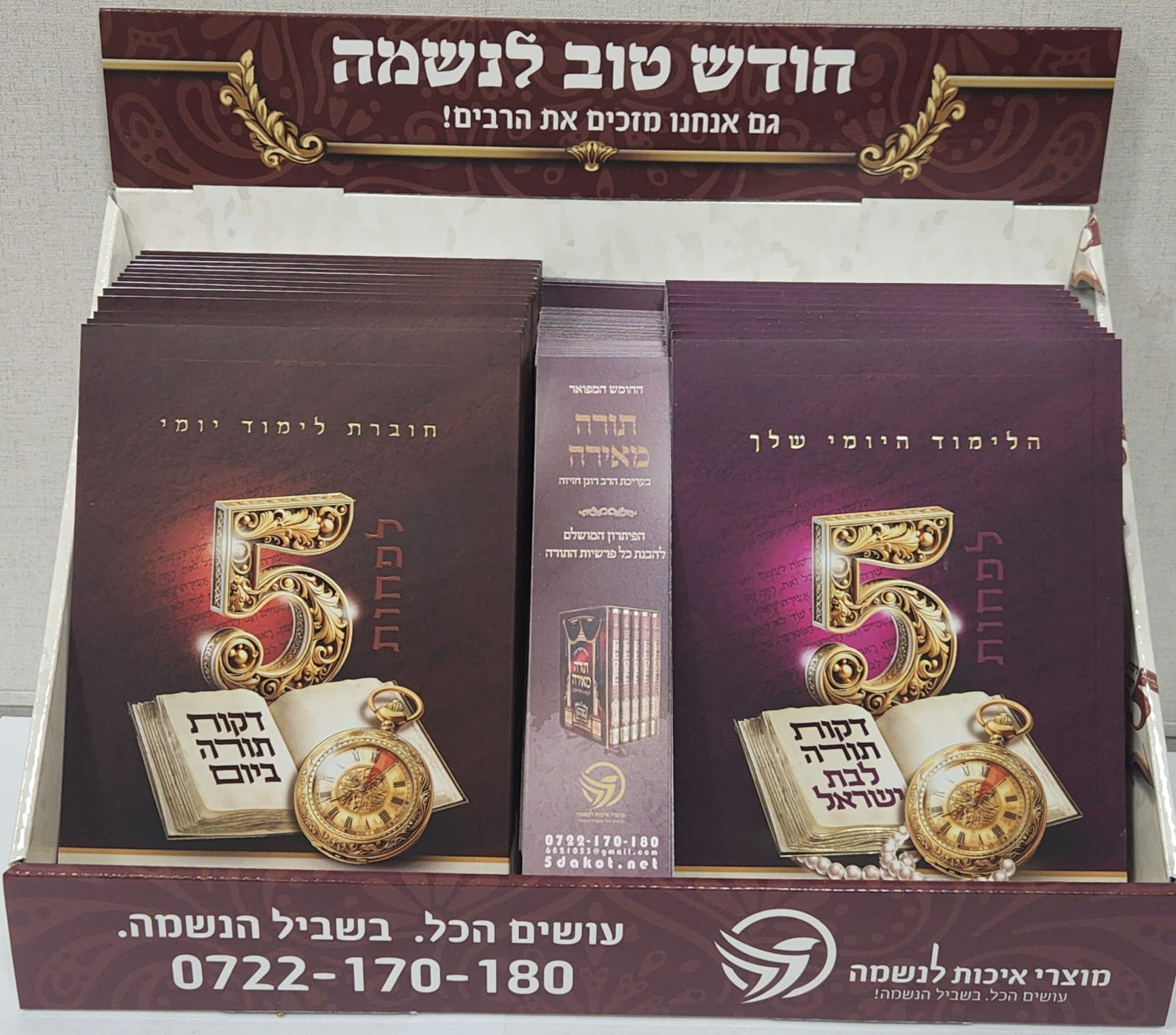 קיבלתי במתנה את החוברת "5 דקות תורה לבת ישראל" - אני לא יכולה להפסיק לקרוא וללמוד. כתוב בצורה מהנה, מרתקת, משעשעת ורצינית גם יחד. בע"ה ארכוש את כל החוברות. ישר כוח !!